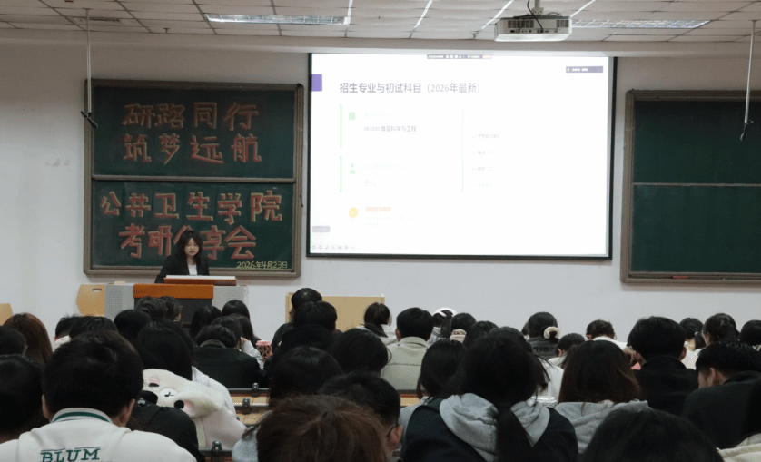 以分专业专场形式,成功举办考研经验分享会。本次活动分为预防医学专场、卫生检验与检疫及食品质量与安全专场,特邀 7 名成功考入国内重点高校的优秀毕业生担任分享嘉宾,为各年级备考学生带来精准、实用的升学指导。分享嘉宾分别被华中科技大学、四川大学、郑州大学、南昌大学、广州医医科大学、上海体育大学、天津科技大学等院校录取,覆盖公共卫生、食品科学与工程等核心专业方向。分享内容聚焦院校选择、复习规划、初试技巧、复试准备等关键环节,兼具针对性与实操性,现场互动热烈、学习氛围浓厚。