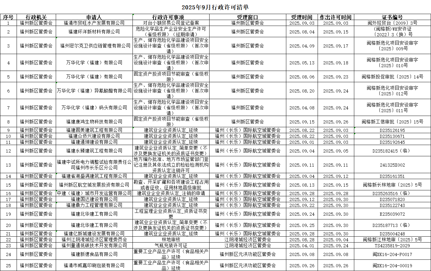 2025年9月行政许可清单