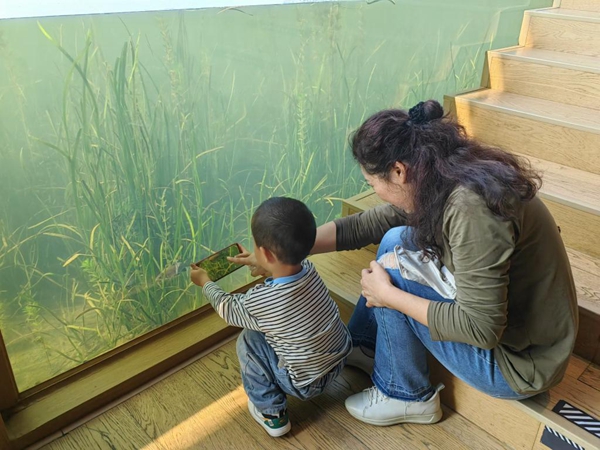 兴隆湖畔的湖畔书店,人们透过书店内的玻璃幕墙,可以看到湖底的景象。新华社记者董小红 摄
